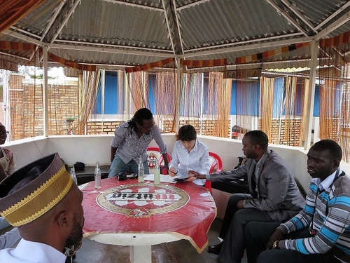 学校側から校長他役員、紙作りを教える地元キブンゴのスタッフ、そしてBPクラフト製作を担当するキガリのアーティスト達、それにプロジェクトの実施責任者の私とが、ホテルの一角で一同に会しました。