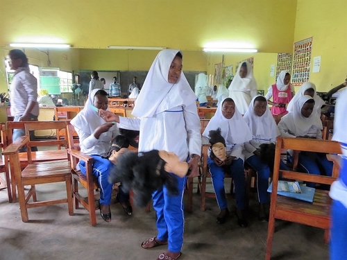 授業開始は5月はじめ、バナナペーパー作りから初めて、次にクラフト製作へと進みます。まず学校側が考えている授業内容を確認し、関係者たちとの日程調整の協議をした後、皆で学校へ向かいました。校長は徒歩15分と言っていましたが、実際は倍近い時間をかけて、ようやくたどり着くと、広々とした校庭が迎えてくれました。そして早速「編み物」「縫製」「ホテルサービス」「美容(ヘアーデザイン)」など、各教科の教室へと案内されました。